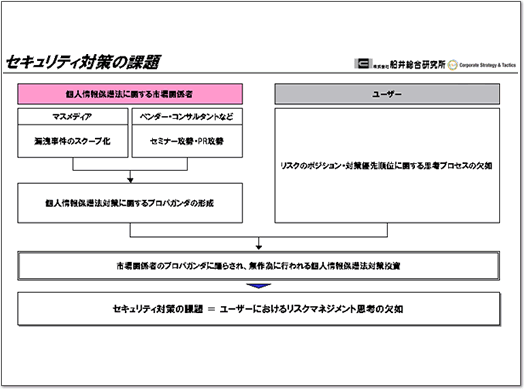 あくまでここで述べたいのは、ユーザーにおける“セキュリティリスクの経営に対する影響を適切に判断し、その課題のポジショニングを明確にして、明確な優先順位の元に実装する”という『セキュリティリスクマネジメント』の思考プロセスが欠落していることがセキュリティ対策の課題である、という現実である。