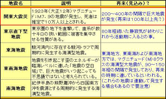 地震は地学上の時間軸で発生する自然現象であって、人間の生活する時間軸での予測はなじまない性質のものとは承知していますが、一般に信じられている情報に従って災害に備えるのはリスクコントロールの観点から好ましいと考えてまとめてみました。