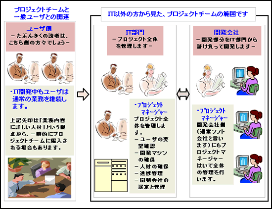 通常は、ユーザからの要求機能を実現するのに、プロジェクトの管理や、テスト以外の開発の部分には一時的に大量の人材が必要となるので、その部分は外部の開発会社(ソフト会社)へ発注します。外部発注先の人材までを含めてプロジェクトの管理範囲として扱う事を理解して下さい。