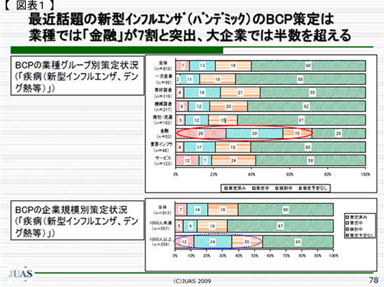 経済産業省(商務情報政策局情報処理振興課)より委託を受け社団法人日本情報システム・ユーザー協会が行った「企業IT 動向調査2009」によれば、事業継続計画(BCP) *3の策定状況は「金融」が突出し、次に「素材製造」が続き、「商社・流通」は対応に遅れが見られます。最近話題の新型インフルエンザ(パンデミック)のBCPを策定・検討中の企業も、「金融」が7割と他の業種に比べ突出しています。(図表1)