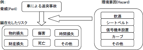 何かしらの直接的な脅威(Peril)に起因して、リスクが顕在化しますが、それをとりまく環境要因(Hazard)によって、リスクの範囲が広がったり影響が悪化したりするケースがあります。 |
